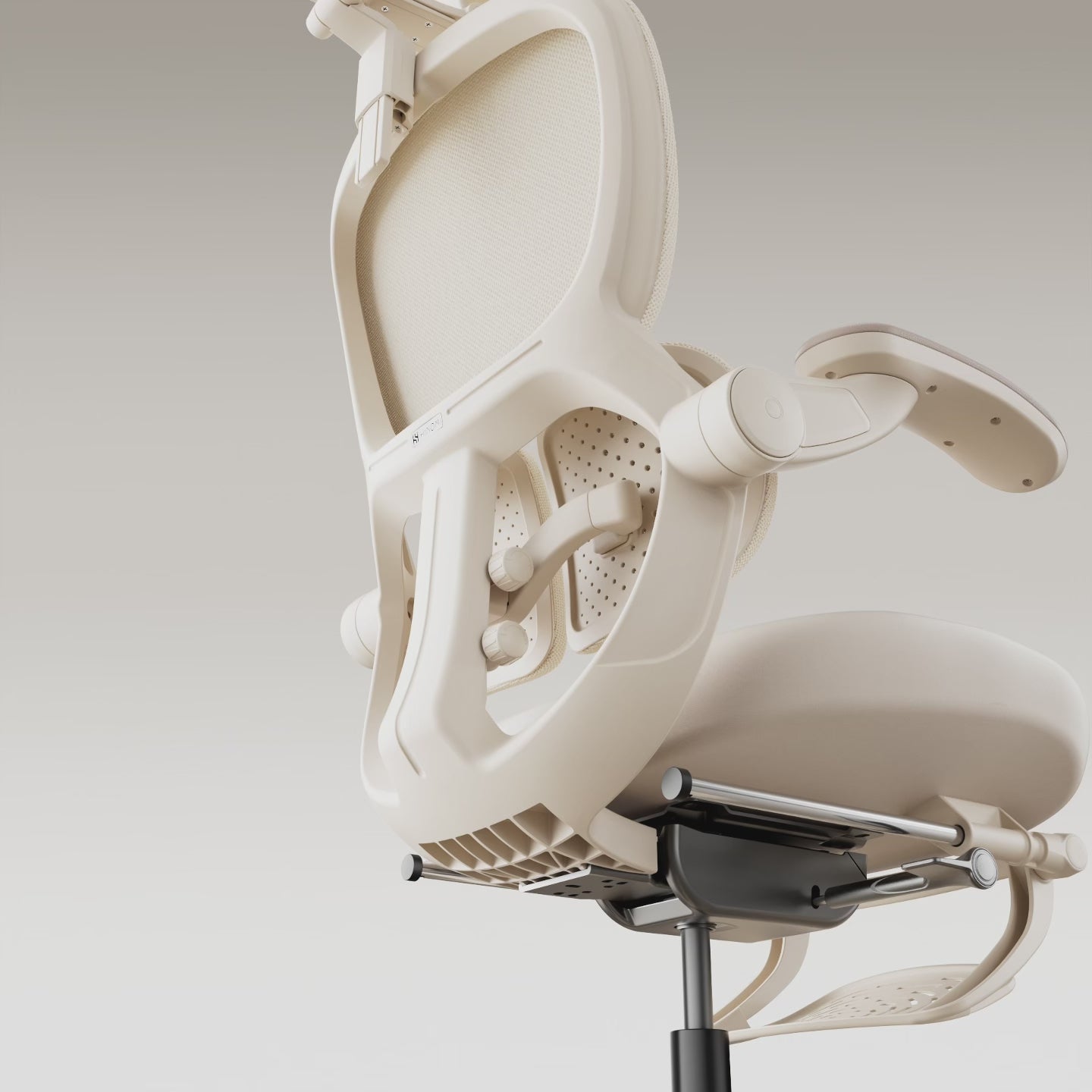 Supportive and cool. The advanced dual-layer woven mesh offers high elasticity and superior breathability, minimizing heat build-up. The seating pad features a soft cushion layer beneath the mesh for a comfortable, balanced sit, while the dynamic 3D lumbar support automatically tracks your micro-movements for constant lower back relief.